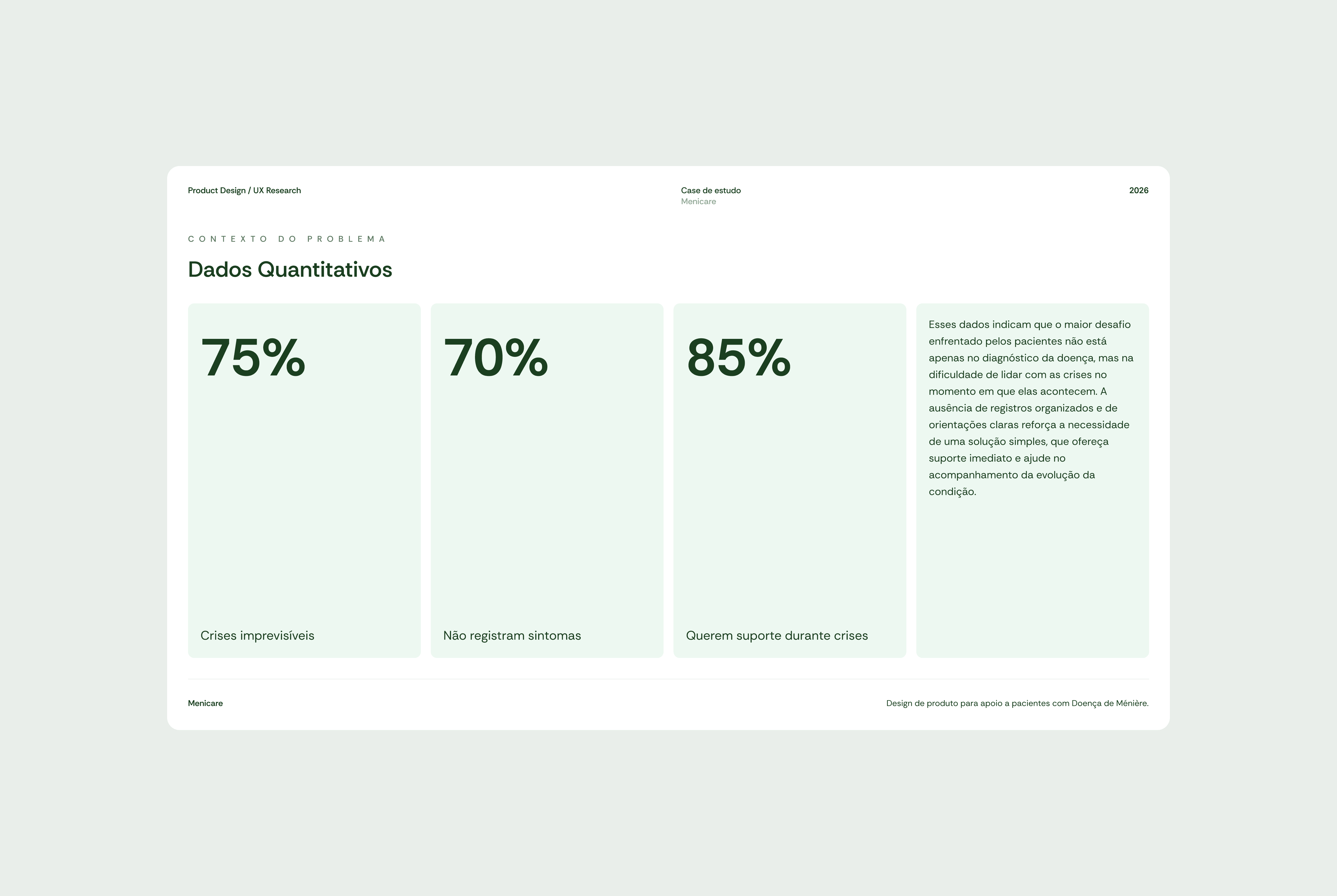 Pessoas que convivem com a Doença de Ménière enfrentam crises imprevisíveis, ansiedade constante, dificuldade para registrar sintomas e pouca clareza para compartilhar informações relevantes com médicos e fisioterapeutas. As soluções existentes são, em geral, fragmentadas, técnicas demais ou pouco empáticas, exigindo esforço cognitivo justamente nos momentos em que o usuário está mais vulnerável. Durante as crises, sintomas como vertigem, desorientação e náusea reduzem drasticamente a capacidade de tomar decisões ou utilizar interfaces complexas. Além disso, muitos usuários não mantêm histórico estruturado de sintomas, medicamentos e gatilhos, o que compromete a qualidade do acompanhamento clínico e das decisões médicas.